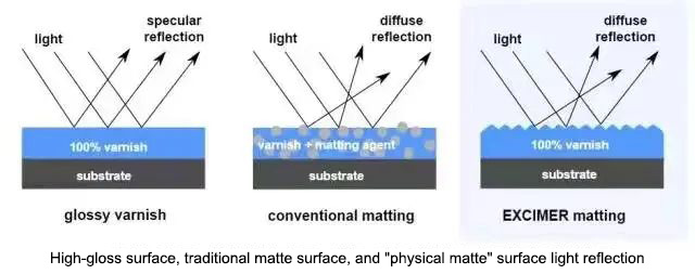 172 nm UV ışığını emdikten sonra, UV kaplama formülasyonundaki akrilat çift bağı, fotobaşlatıcı olmadan serbest radikaller üretebilir.Aynı zamanda, 172 nm UV'nin penetrasyon derinliği sadece 100 ila 500 nm'dir, bu nedenle kaplamanın yüzeyinde sadece çok ince bir tabaka kürlenir.Bu ince tabakanın polimerizasyonu ve çapraz bağlanması, pürüzlü bir yüzey oluşturmak için büzülecek ve yüzey mat etkisini elde etmek için sertleşmemiş alt sıvı üzerinde yüzecektir.Ancak çalışma ortamındaki oksijen konsantrasyonunun 100 ppm'den düşük olması için bu kürlemenin nitrojen ortamında yapılması gerekmektedir.Bundan sonra, tam kürleme için geleneksel UV veya elektron ışını kullanılır.